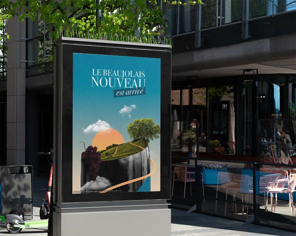 Pour ce projet, j’ai voulu explorer le photomontage. J’ai assemblé les éléments que m’inspire le Beaujolais (bouteille, raisin, vigne, soleil) pour créer une seule image qui les réunit.