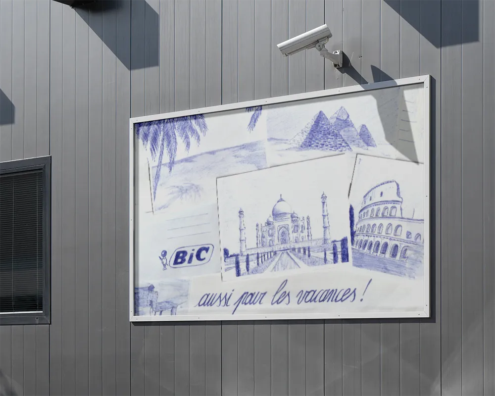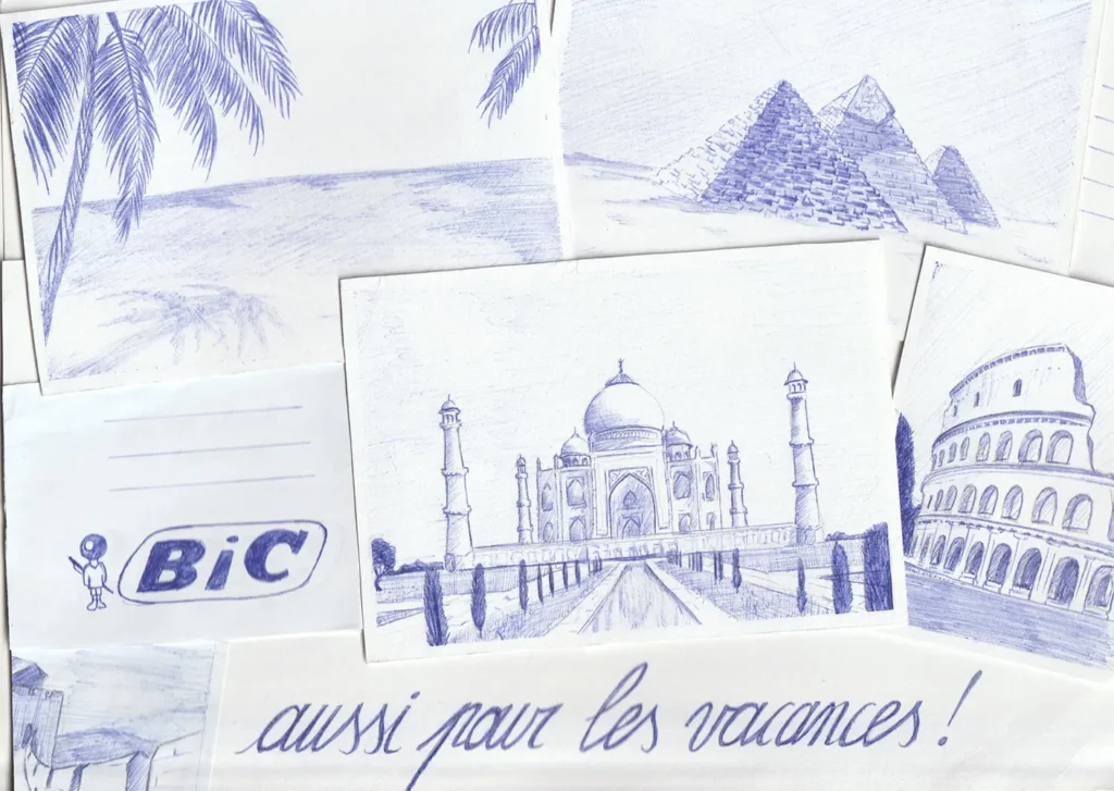 Ce travail est né d’une affiche dessinée entièrement au Bic. J’ai voulu montrer qu’au-delà de l’outil scolaire, le Bic peut aussi devenir un compagnon de voyage, celui qui permet de capturer un paysage ou un souvenir en toute simplicité comme je le faisais en vacances lorsque je n’avais qu’un stylo bille à portée de main.