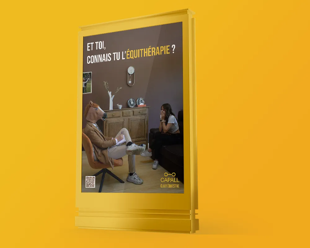 J’ai utilisé ce décalage pour attirer l’attention dans ma campagne. Mais l’objectif était également d’informer : le site de Capall, accessible via le QR code des affiches, présente concrètement l’équithérapie à travers des vidéos et des textes explicatifs.