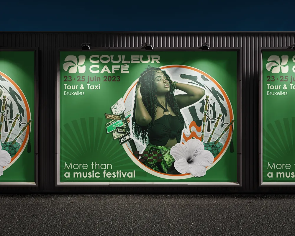 Pour cette affiche, j’ai voulu mettre en lumière l’esprit du festival en jouant avec un photomontage qui célèbre la diversité culturelle et musicale de l’événement.