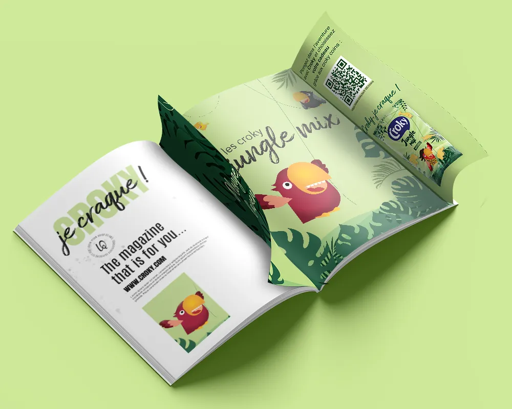 Pour la mise en page , j’ai décidé de sortir du format classique en créant un système de double page : la première page invite le lecteur à « plonger dans l’aventure… ». Cette page est dotée une languette : en tirant dessus, les deux volets s’écartent et révèlent la publicité principale. On y découvre alors le perroquet, mascotte de Croky, en pleine exploration de la jungle.