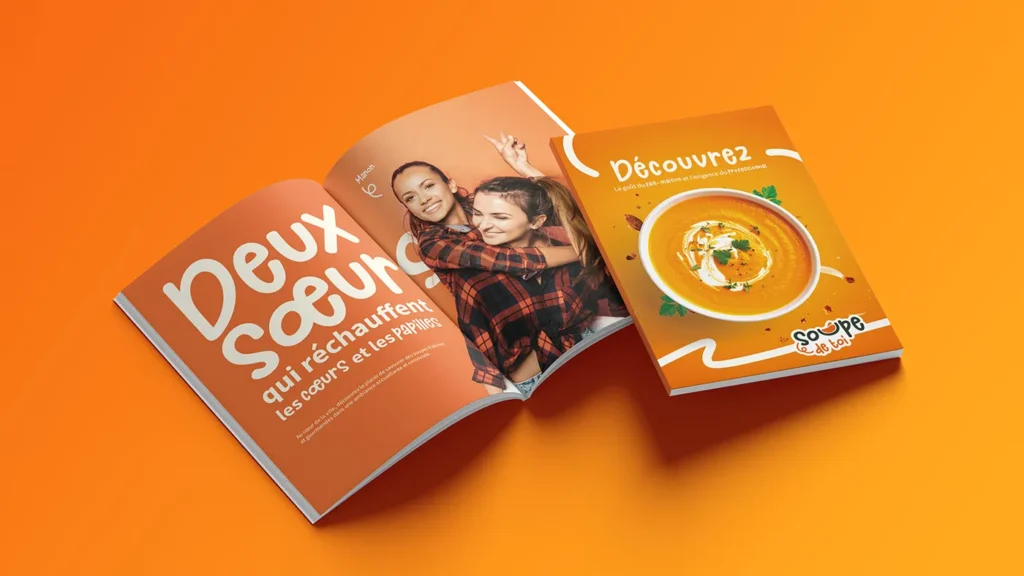 L’objectif de cette plaquette est de présenter Soupe de Toi et de plonger le lecteur dans son univers. L’identité de la marque se reflète à la fois dans les textes et dans l’identité visuelle afin de créer un ensemble cohérent et immersif.